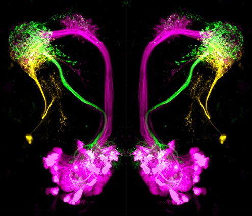 The Drosophila may be the most studied insect in science laboratories. Experiments with the Drosophila go back more than 100 years (Thomas Hunt Morgan, January, 1910). To the untrained eye, the picture above this paragraph seems to show a Drosophila brain with highly integrated neurons. What does research indicate?